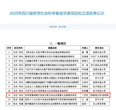 该项目于获批2025年四川省哲学社会科学基金年度项目立项。该项目以科技强国与教育强国战略下的时代使命为锚点,聚焦科学家精神与思政引领力的深度融合研究,系统探究二者在理论层面相互支撑、协同赋能的内在机理,创新科学家精神提升思政引领力的本土化实践路径,并构建科学完善的效果评估体系。项目立足马克思人的本质理论与社会意识理论溯源,结合四川地域特色开展本土化实践探索,推动科学精神与人文精神的辩证融合。通过深挖科学家精神的爱国、创新等核心内核,激活思政引领力在政治、价值与实践层面的多维引导效能,搭建二者在育人目标上理论同构、功能互补的内在逻辑,探索基于地域特色的课程、文化、实践融合策略,为新时代思政教育提质增效、培育担当民族复兴大任的时代新人提供理论支撑与实践范式,助力科技强国与教育强国建设。